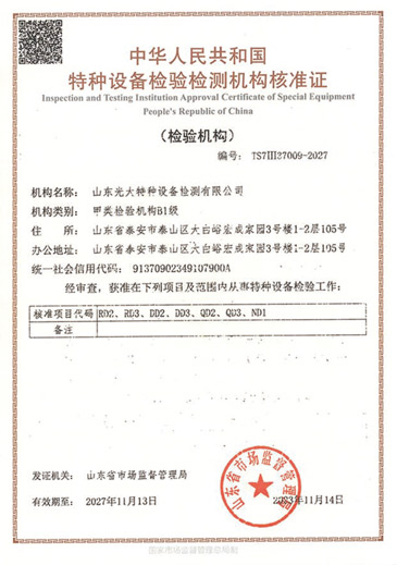 【特種設(shè)備檢驗(yàn)資質(zhì)和檢驗(yàn)范圍】 RD2 定期檢驗(yàn):第一、二、三類固定式壓力容器(不含超高壓容器,大型高壓者器、球形儲(chǔ)罐) RD3定期檢驗(yàn):第一、二類固定式壓力齊器(不含球形儲(chǔ)罐) DD2定期檢驗(yàn):公用管道 DD3定用檢:工業(yè)管道 QD2 定期檢驗(yàn):塔式起重機(jī)、流動(dòng)式起重機(jī),門座式起重機(jī),升降機(jī),纜索式起重機(jī)、梔桿式起重機(jī),額定起重量小于 10T(不含10T)的橋式起看機(jī)和門式起重機(jī) QD3定期檢驗(yàn):流動(dòng)式起重機(jī),塔式起重機(jī),升降機(jī) ND1定期檢驗(yàn):場(chǎng)(廠)內(nèi)專用機(jī)動(dòng)車輛 ...